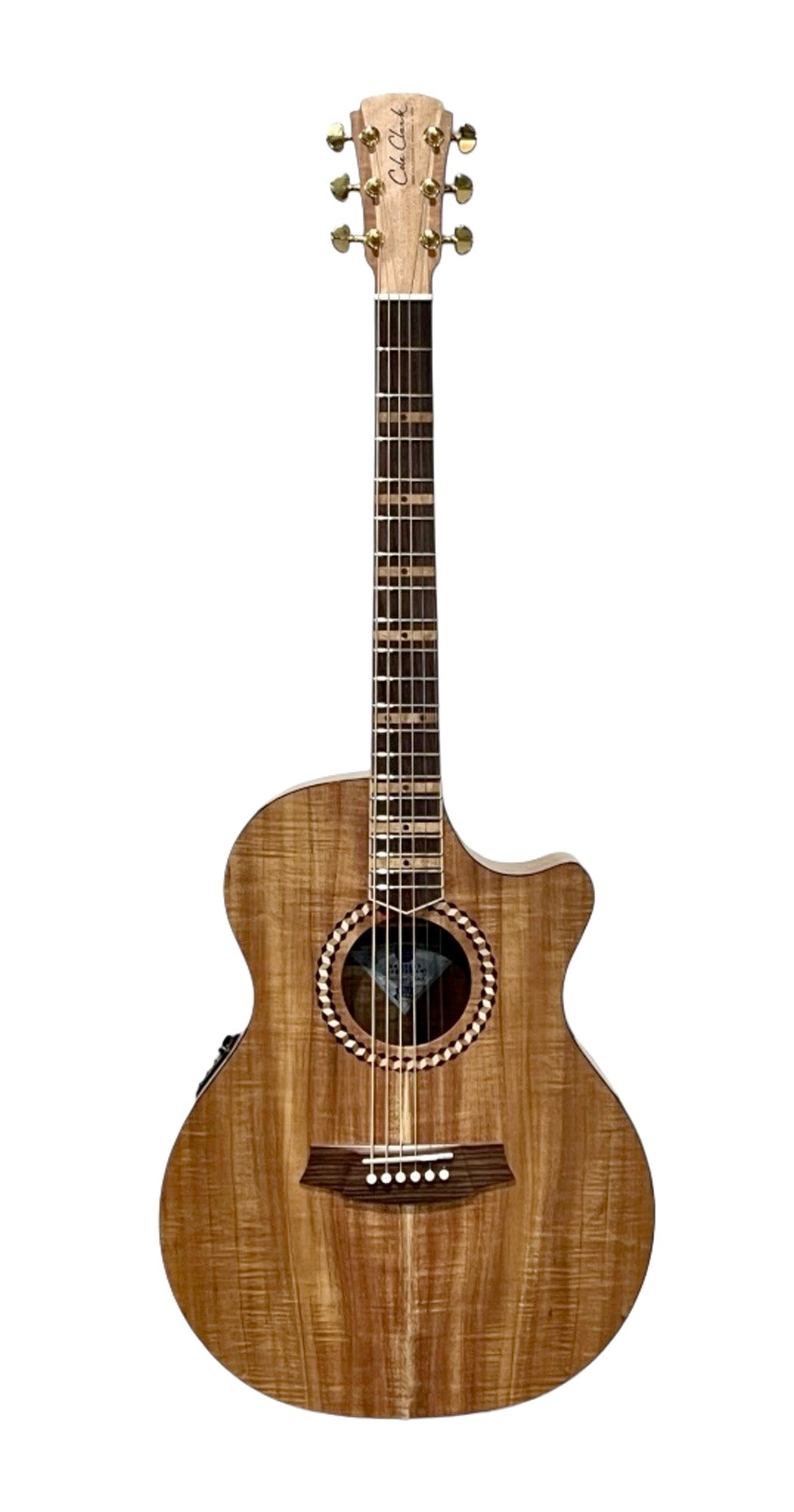 Studio Recording, Grand Auditorium pan coupé, EQ 3 voix PG3, table blackwood massif, fond & éclisses blackwood massif, table et fond sculptés de l'intérieur, manche acajou ou érable, sillet 44 mm, touche & chevalet palissandre, mécaniques Grover, sillets Tusq Graph Tec, vernis nitrocellulose, cordes D'Addario XS Phosphor Bronze 12-53, pickguard fourni, avec étui tweed.