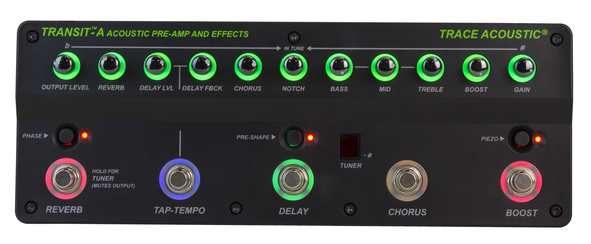 Pédalier d'effets et préampli TRANSIT-A pour guitare acoustique, commandes rétroéclairées, accordeur chromatique intégré, bouton Piezo pour augmenter l'impédance d'entrée, switch boost personnalisable, chorus à un bouton, delay avec contrôle de niveau, feedback et Tap Tempo, switch Pre-shape pour courbe EQ classique Trace Acoustic, reverb, switch d'inversion de phase, EQ actif 3 bandes, filtre Notch, contrôles de Gain d'entrée et de niveau de sortie, sorties stéréo et dry, sorties XLR Pre/Post équilibrées avec Ground Lift, entrée auxiliaire, sortie casque, dimensions (pédale seule) : 31,2 × 11,4 × 5,8 cm, poids : 1,18 kg.